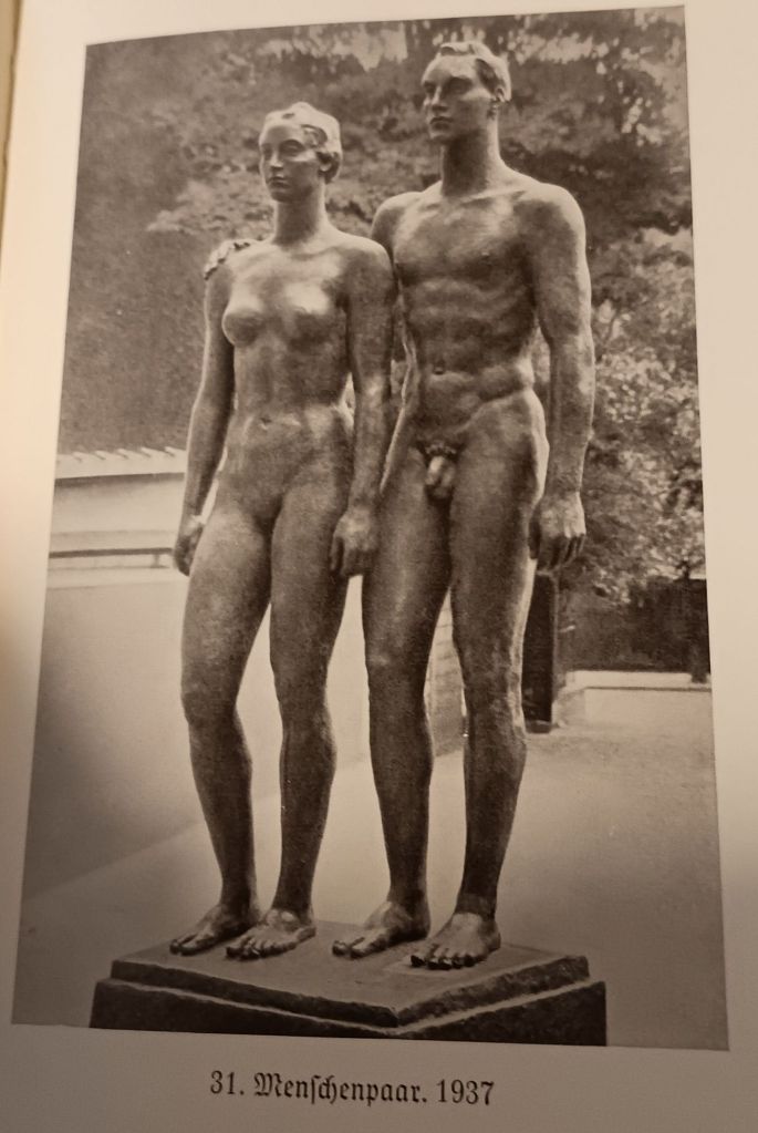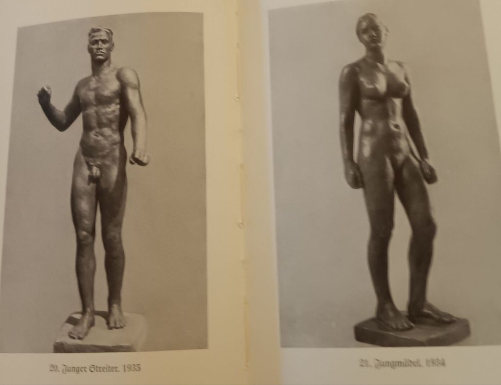 However, by the 1930s there is a severe change in the figures. According to Wikipedia, the young Kolbe was fascinated by Asiatic faces and body forms, siuch as wonderful 1911 Japanese Crouching Woman amongst the Wikipedia examples. The thin evidence I see in the book suggests that the human form was admired for its diversities of being and acculturated expression, that as it were, transformed simple and conventional notions of being. However, this is not so in the figure below, who deviates not all from idealised Aryan type that the Nazis encouraged as the form of patriarchal Germanic nationhood and imperial dominance. Hitler became Chancellor in 1933. His grip on the art establishment changed the nature of commissions, and though some say Kolbe refused to sculpt Hitler himself he dis produce a figure of Mussolini which Hitler accepted as a gift.