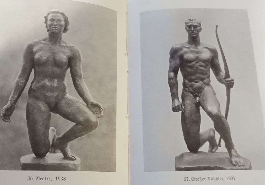 Male and females created alone had clearly contra-distinguished postures as if this too were a fact of biology.The man below is armed with medieval weapon and the posture leans him forward in active advance on the viewer, overwhelming them. Everything is tight, from the muscled casing of the body to the clench on the bow and in the fist. Beatrix (1938)has her arms forced back by muscles at her shoulders, is as open in gesture – open palms, outspread arms as he is tightly closed. Whilst he projects outwards, she invites in. She is not submissive but she does know that her biological role is to give way, accept her destiny as a woman – as a mother, already equipped to feed the patriarch’s sons.