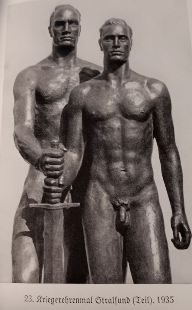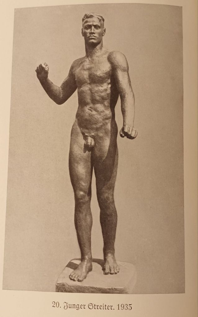 An emphasis on the size of the penis as Kolbe’s 1935 Junger Greiter both makes that single body feature focal and the rationale of the posture. The musculature is not seen armed but it is militant. The fight though appears to be tne inalienable right of a superior race to propagate its biological birthright, and with it an appropriate masculinity as its emblem. The whole postures emphasises the erect, even the arm gesture and the back foot is not arched as if in mid-movement as in the Doryphoros example. ,This man advances on you asserting his right to do so as if nature and biology commanded it. Such ideologies were not confined to Fascism in the period but represented widespread belief about eugenics amongst the European intelligentsia and were happily passed on to the masses (see my blog at this link) And armory could be shown and male bonding, of a supposedly non-sexual form, thart emphasised even more this masculinity-bound and naked imperial ideology based on the power of the phallus.