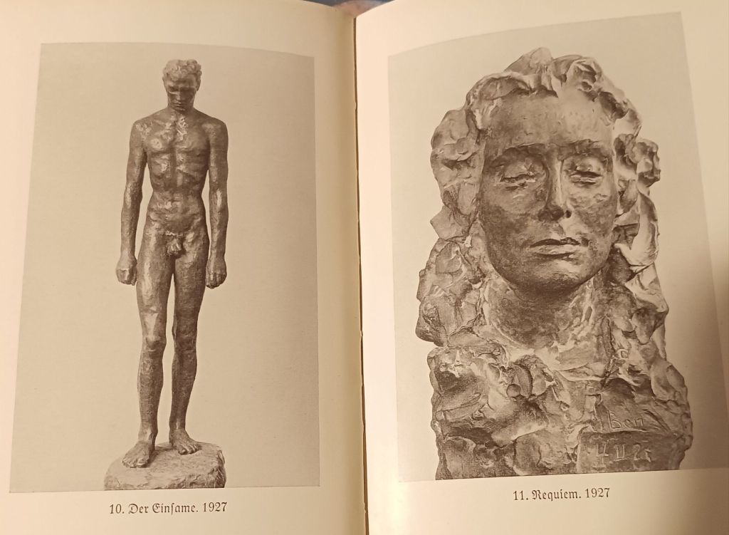 The photographic method in this book entirely flattens the artwork and removes any suggestion of freedom, flamboyance, or ‘bohemian’, or other kind of, wilder ‘degeneracy’ or idiosyncrasy. Hence this work did not stand out as much from other art in the book as it does to me now. However, to be fair, you only have to look closely to see large differences in style, freedom and honesty as in the two earlier pieces below. The bust of the musician seems to extend into some redemptive life in the carving of the hair as if the latter represented the life of his music over a face presented in the form of a male death-mask , the male standing figure almost to look like like the emaciated nude male forms in Schiele The man is beautiful but not idealised, his arms hanging limply like his head towards something ‘grounded’ in its appearance. Nothing in either lends itself to ideological versions of sex/gender.