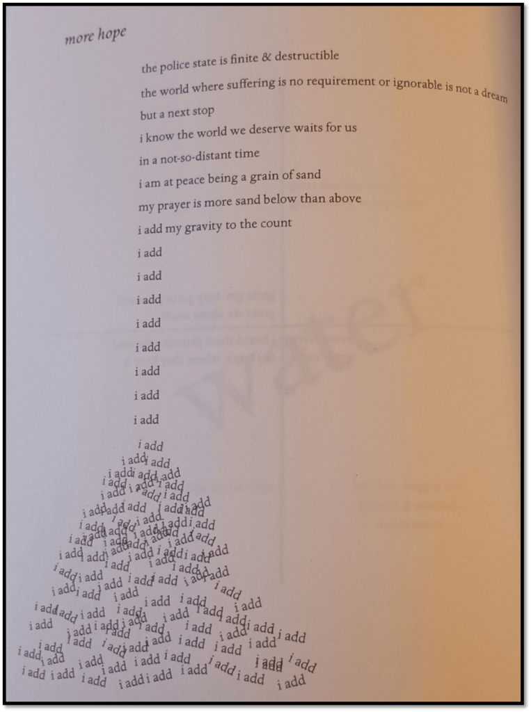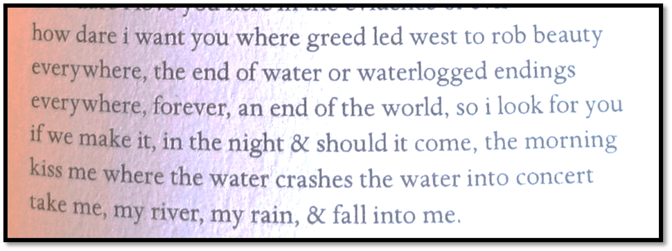 .., in these lines, in these rooms i add my blues & my gospel to the record of now, I offer my scratched golds to the blueprint of the possible, dear reader wherever you are reading this is the future to me, which means tomorrow is still coming, which means today still lives, which means there is still time for beautiful, urgent change which means there is still time to make more alive which means there is still poetry.[14]