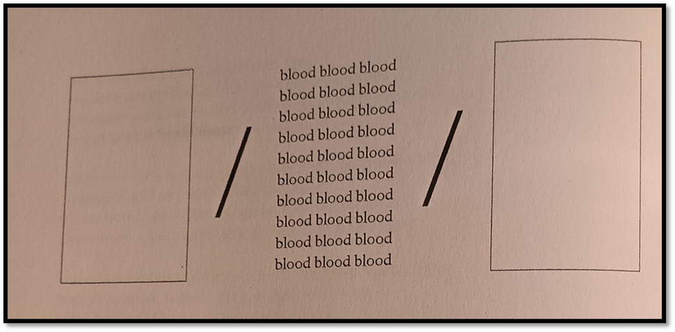 It present various options in which Blackness is either the page on which I write, and in which case I must write and type in white. Moreover since pages are by convention white (or off-white, even that black page is a ‘black box’ which imprisons me inside it, even where I try to shift its borders or boundaries. Or instead I type in black but can only do that on either a whole white page or in the margins of a page with a black box. Whichever way I turn my craft (represented in the revolutions and movement of text I am trapped, as in a black box into whose interior margins my ‘I’ is forced, and forced to look white. The poem after that one has marginal black text outside the box in order to, forced into justified borders (so each line is exactly the same length as the last) which I can’t reproduce below: