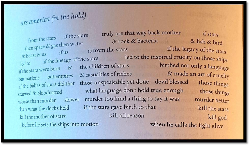 In Bluff, as well as making a world by naming it with white names, ideas and responses into which Black people cannot get a hold, other than in the memory of a cargo ship’s ‘hold’. As for the ‘hold’ where Black experience is contained and held back from view, it becomes the form of the poem ‘ars America (in the hold)’ – below:[5]