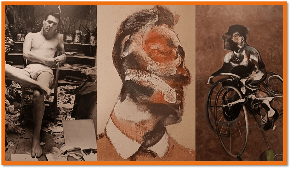 I do this because art historians often desexualise queer imagery. In the picture of George Bacon’s want and need of his admirable body, by the standards of the period this was admirable, and the pose that emphasised the crotch of his lover. The apocryphal story is that George was burgling Reece Mews when bacon negotiated that if George went to bed with him, he would not call the police. In fact it appears George first saw Francis at Muriel Belcher’s Colony Room (see my blog on this drinking club at this link). But George is not a mere sex symbol in the example paintings I show here. The picture of George on a bicycle so confounds figure, machine and ground that we struggle to capture an image of George, as if the intense and overlarge central facial detail in skin tones were an image locked inside either the image or its perceiver as a memory of a man going by who is otherwise overlarge for his bike and in peril of the loss of control of it.
