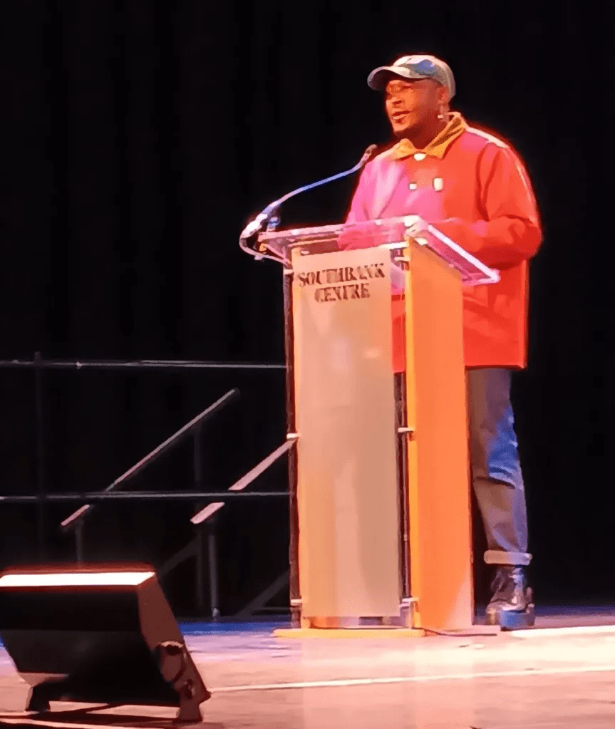 The seats were empty, and then Danez entered making straight for the lectern, until he realised his interlocutor was not yet with them. Meanwhile he told us about getting caught up in the police action protecting the English Defence League action in central London protesting the arrest of Stephen Laxley Lennon, that white middle class racist who calls himself Tommy Robinson to appeal to his racist supporters the more. How much more ugly, said Danez , is that kind of hate than in the face of old ugly white men – maybe! Though the Black face of the Tory party can be as ugly at the moment it puts on White airs. I feel a need – felt one then – to get beyond the nuanced binaries, though we have, we just have, to understand the main responsibility for this lies in whiteness of the ideology of the benefits of White cultural history bluffing us it is the history of all of us and not just the privileged few.