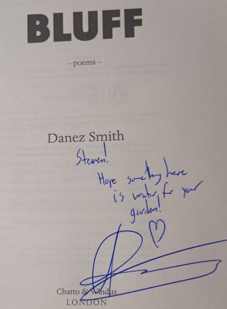 But why should White people,and me included,expect never to learn that feeling of exclusion, well earned in their cultural history and inherited forms of current day cultural boundary-making. At a later point Victoria Adukwei Bulley, interviewing Danez, spoke of how badly white critics take to the address to verbal violence in poems. They call them ‘raw’, Smith laughed: ‘meaning “get them edited!”‘. For Victoria this comes in part from a failure of the critics in a white hegemonic culture to understand Black humour and irony, but I wonder if that oversimplifies. For the unconscious bluffs of white culture were to some extent replicated in this event – in the performed closeness of the interviewed and interviewer, the selection from the audience of questions know to be friendly from members of it known personally as a writing colleagues to Victoria. But we don’t notice that usually in events where everyone speaks the hegemonic language of White artistic culture. That an awareness of mutual exclusions, where one is based on greater and wider power over the other, as a in White hegemonic culture, is sometimes mediated by the worst human emotions such as fear and suspicion is hardly surprising, and ought to be expected. To expect it not to exist is naive.
