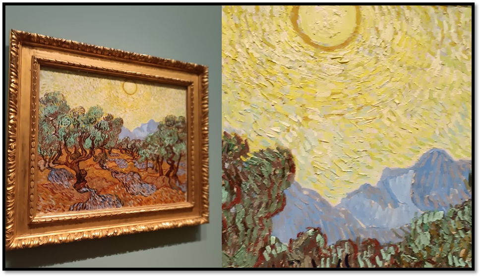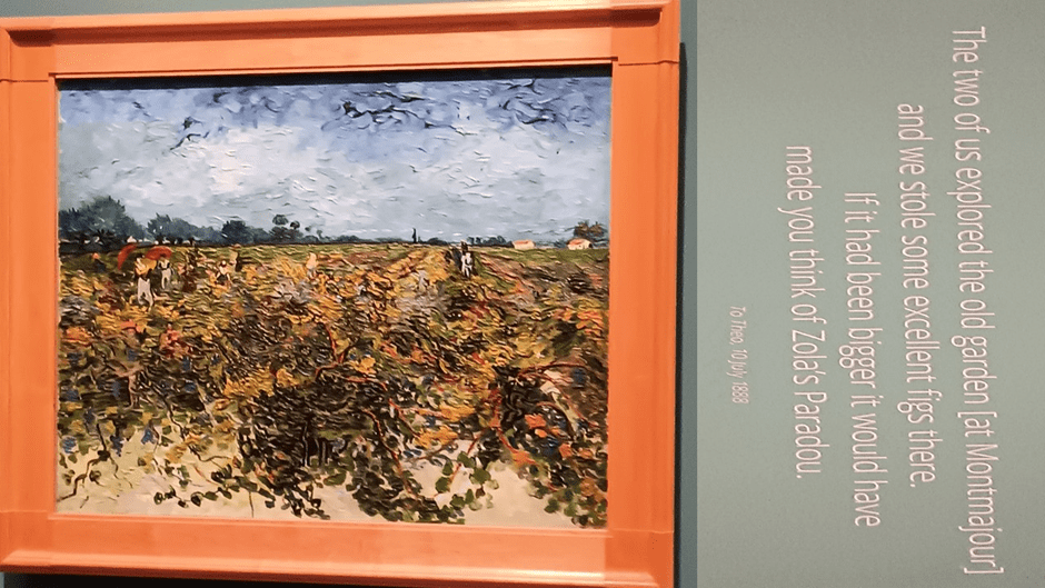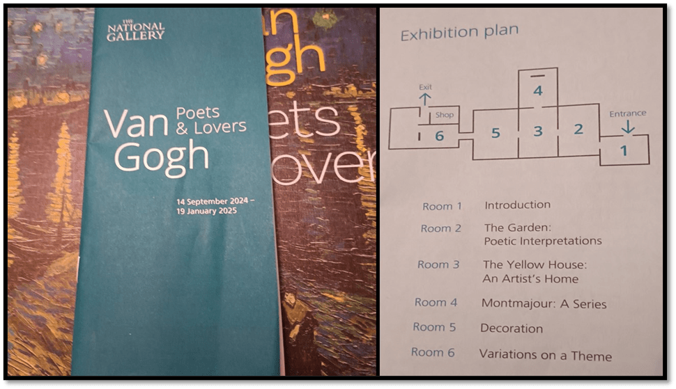 The basics of ‘almost certainly the strongest art exhibition I have ever seen’: the free guide sitting atop the catalogue already introduced in my first blog and the guide to the themed exhibition spaces at the National Gallery in the free guide. The thematic-historical curation of the pictures aims to introduce us to a way of seeing Van Gogh’s work as exemplified in Provence in particular, focusing on symbolic interpretation (focusing on gardens in particular) and utilising a sophisticated interpretation of Van Gogh’s view of décoration as a holistic view of art’s function.
