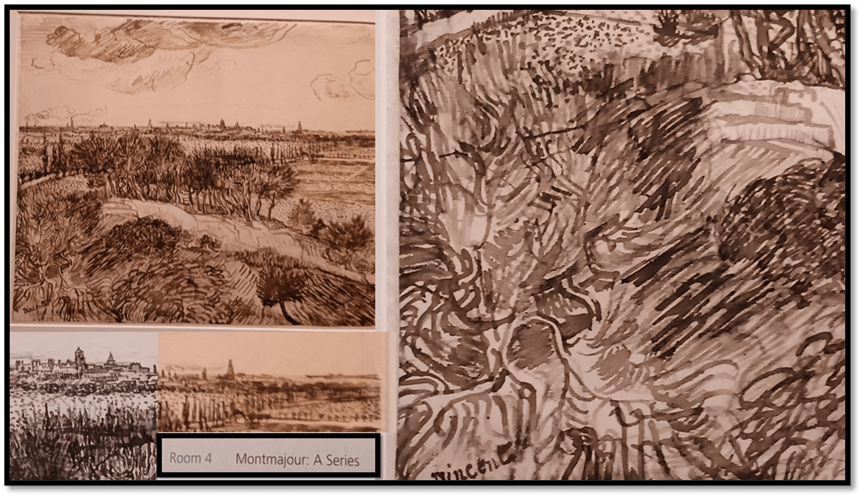 I had intended this piece to help me to penetrate the mysteries around Van Going in my mind, especially the link to Zola and the potential to what I was going to call naturalist iconography – a view of nature that combined the observed and the hypotheticals of science on the one hand and a link to the symbolic art of the past. It would have centred on the use of ‘Paradou’ (in Zola’s The Sins of Abbé Mouret) as a setting – this for Van Gogh was the place Montmajour, also a garden around an ancient dwelling, set away from the Arles, that he visited with The Lover, Milliet, and about which he wrote to Theo: ‘The two of us explored the old garden and we stole some figs there. If it had been bigger, it would make you think of Zola’s Paradou’. However Van Gogh was far too good a reader not to notice that Zola makes Paradou infinitely extensible to match the narcissism of his lovers in it. Below I link the quotation to an Arles Landscape that is not Montmajour (in the exhibition these are all wonderful sketches and drawings) but it gets the size-longing and passion right.