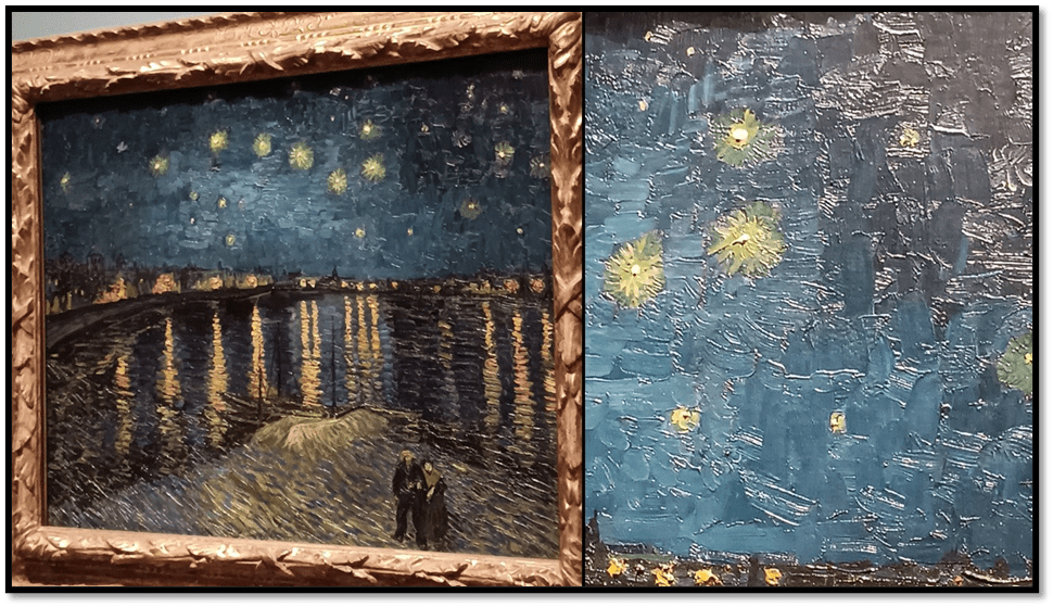 In both light is approached through complex patterns of colour. To me they operate dynamically, a little like music and evoke a mixture of scents – like those that kill the character Albine in The Sins of Abbé Mouret, a novel oft evoked by Van Gogh to capture the art of Provence in his revision of it. Sometimes the energy of voluminous impasto passages break through the conventions of representation as below: