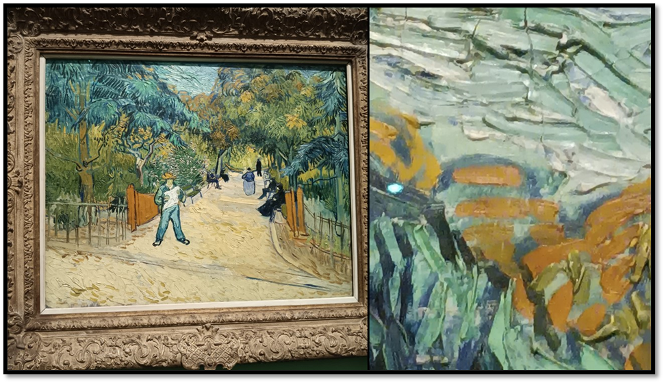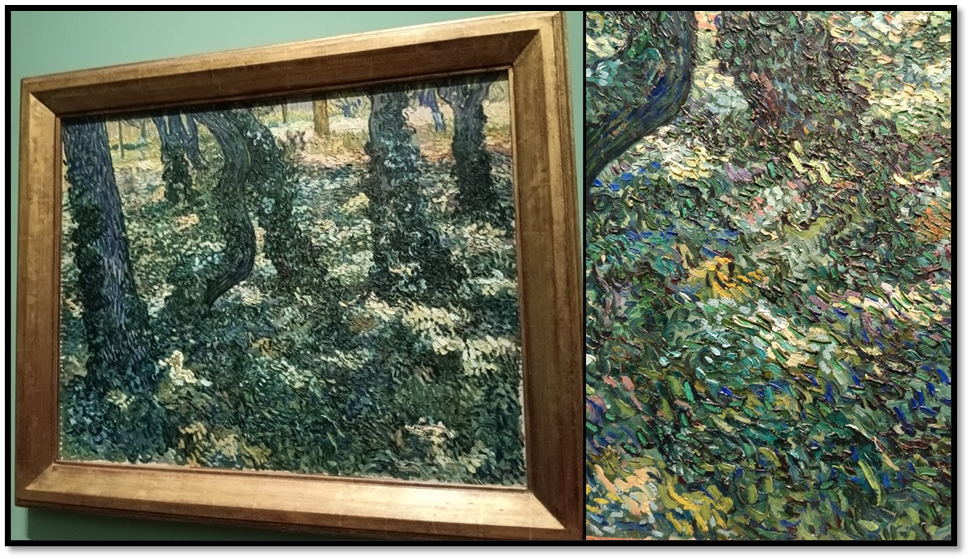 Whatever this exhibitions sets out to prove about gardens as icons of time in Van Gogh, and whether it succeeds or not may hang I think on the recognition of the means that gardens are constructed and the use of impasto techniques matter throughout. Although I have collected many examples and spent hours making collages, because my husband is ill I have no energy to discuss them all, or perhaps any of them. If I had to hazard a guess at the import of impasto, I would say it is the path to a kind of synaesthetic approach to Van Gogh – the striations of the method conjuring up a mix of senses, especially in flora, as in the examples below: