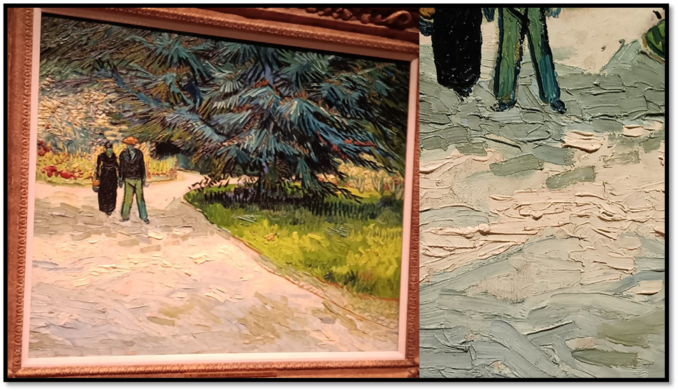 Both were associated with Van Gogh’s iconic subject of this period, according to the curators, the garden. It is a garden in which lovers walk, but the roughest impasto of this painting is reserved for the paths which seem to break up any sense of sure footing for those lovers, barely walking in step and oozing distance from each other. The aim of impasto here is to make the dark shadows in the park as solid as scarred flesh.