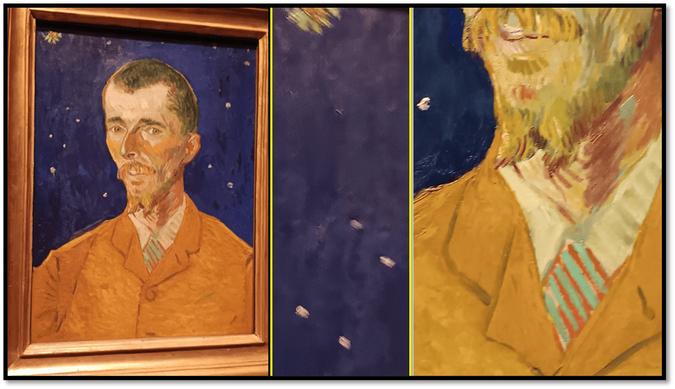 But my topic is impasto painting – the play of layers. And I think it is clear that the background of this painting is less one of a boasted arbitrary colour but of a colour turned dynamic by marks made upon it by something embodied, and witnessed in their absence now in these remaining marks (and perhaps never visible to the sitter). These marks are the marks of variously applied impasto that streak it with emotion. They make us see the raised eyebrow of the man as a sign of something superficial in him to the passions he invokes. The impasto effects are those by which something embodied has caressed the ground behind the figure, finger-marking it whilst fluid into a hardened spatial symbol of passion lost, where even symbols of war are transformed into something less hard and less easy to read. Is this why Van Gogh reverse the Zouave isignia of the star and crescent moon? Milliet resides in the pinks of his ears, nose and mouth (which reveal the strange green tinge in the skin) as thet mark the moment of recognition of another. The lively eyes are part of this too -– each of these features touched with fine impasto brushwork if less irregular than in the green velvet background.
