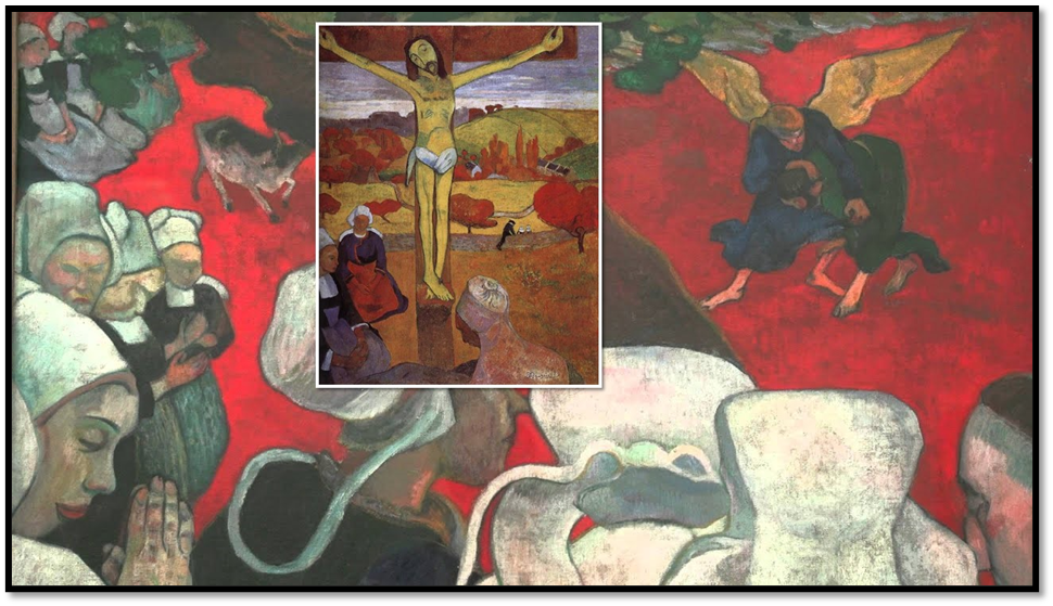Certainly the ground in which these figures stand is highly imaginative and excitingly coloured but it wasn’t quite like the example of Emile Bernard and Gauguin as ‘arbitrary colourists’, with whom he was in correspondence, that he was evoking. After all ‘dull walls’ are often painted – nay decorated – imaginatively in the real world. The ‘arbitrary colourist’ might be expected in contrast to paint a field in arbitrary solid red patches to form a background to a ‘vision’ that is half dream, as in Gauguin’s The Vision at The Sermon or the figure of a body coloured bright yellow (in the same artist’s The Yellow Christ). In these cases, both Gauguin and Bernard used arbitrary colours to announce the supremacy of the imagined over the viewed landscape in the theory of painted art.