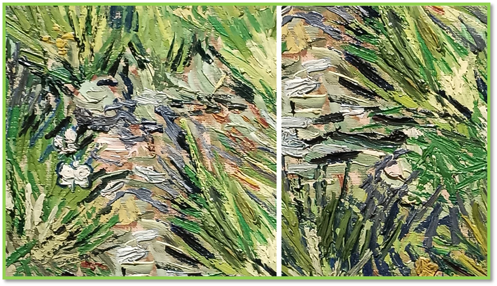 Let’s start with a couple of details from the painting Long Grass with Butterflies (1890) for it is the painting that most caught my eye in the exhibition and I sent out one of these details to friends . It is a detail from a painting that I did not know previously but which amazed and surprised me in regard to Van Gogh’s treatment of natural flora and fauna. As I looked again and again, and refreshed my memory of the curators’ intentions, I found that the constant amazement and surprise throughout was in part because my eyes were open to Van Gogh as they had not been before.