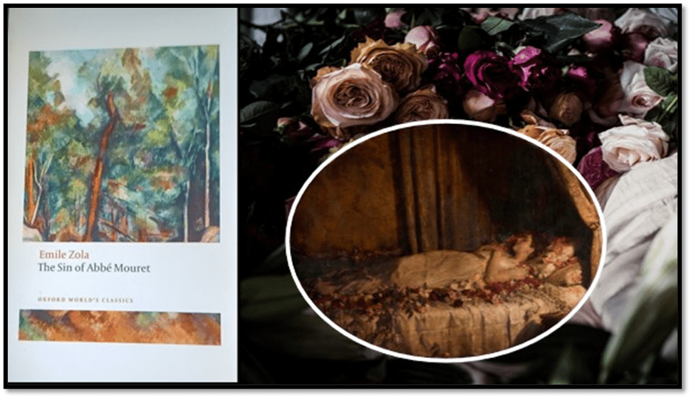 The attention of the later nineteenth century (as in the pictured Pre-Raphaelite Collier painting (circled detail) and a feminist conceptual new film, (surrounding the circle) The Death Of Albine). Albine dies by suicide facilitated by overwhelming herself with the scent of multiple flowers from the garden in Paradou (the scientific-modern & traditional symbolist ‘Paradise’ of the novel). The Oxford cover of this translation uses Van Gogh. That suggests a much deeper engagement with Zola’s contribution to the theory of the Naturalist arts, which should not be confounded with social realist arts, as it often is.