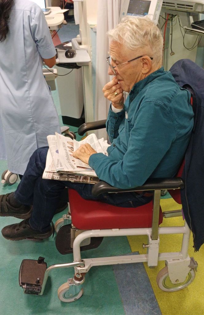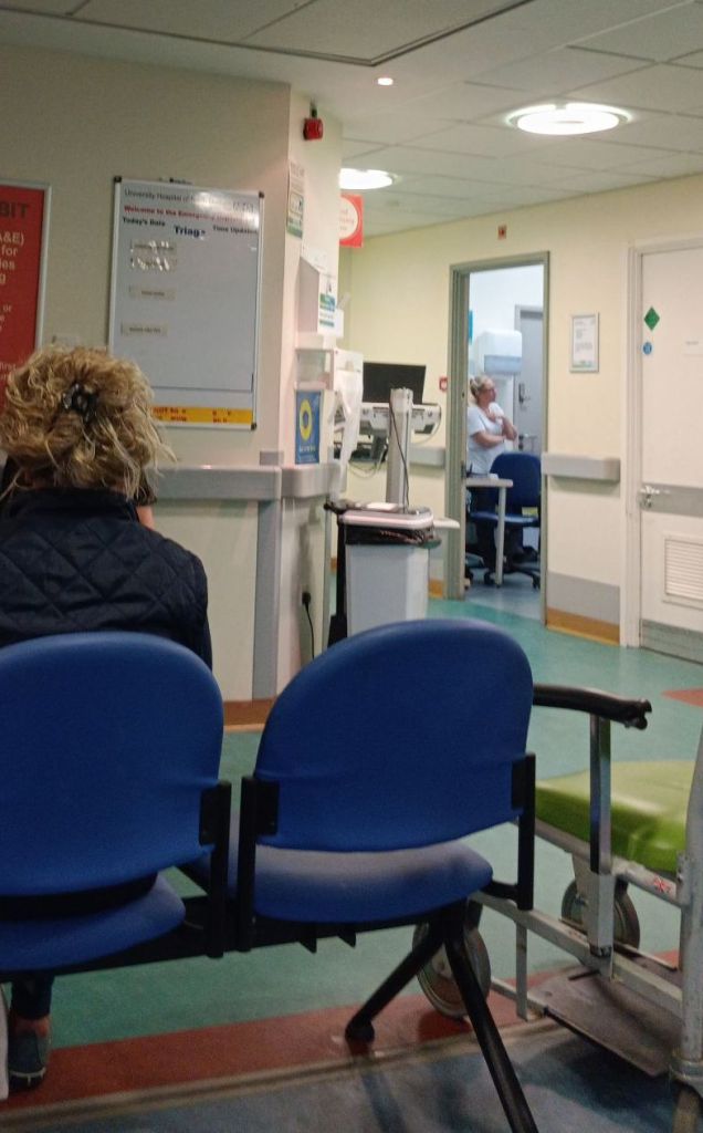 We were hours sat in Casualty (he in his wheelchair) but his blood oxygen refused to rise. He was put on oxygen, an X-ray revealed ‘shadows on the lung’ and tests later leading to a diagnosis of pneumonia. This morning, though being on enhanced oxygen supply has corrected his blood pressure his blood oxygen remains in the dangerous are of 88 – 92. He still has had no breakfast and cannot sleep in the noisy ward.