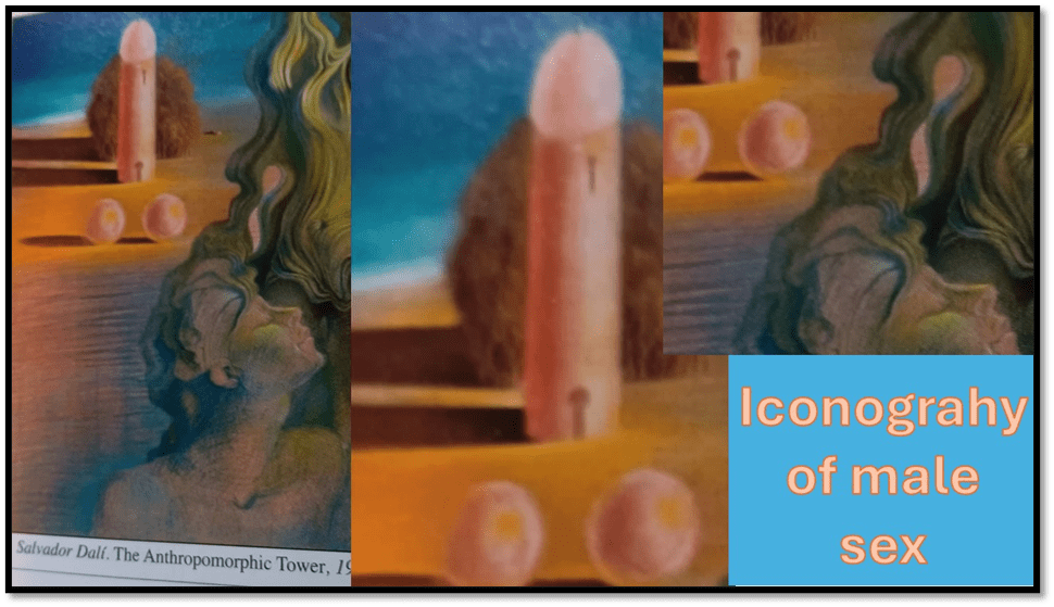 Whilst Dalí explored feminine male roles in his paintings the great puzzle to unlock (see the keyhole icons below) was for him, and all men he thought, the centrality of the ‘anthropomorphic tower’, the largely conceptual phallus that is situated in the highlight of desire in his painting. The androgynous male pictured below the phallic tower emits sperm from an imagined phallus, it’s bell alone visible, in his own headthat merges into the flow of his feminised hair, in which his arms are lost in orgasmic delirium. I do not like this painting (see it above from the reproduction in the cited article).