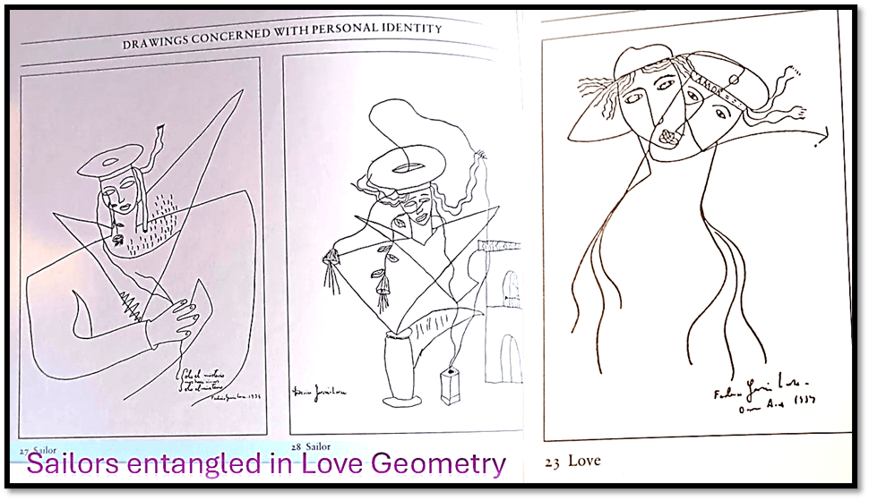 His lone sailors may be more clearly masculine (left and centre), but they have very fluid boundaries that constantly play games with the icon graphic representation of male and female, inside and outside and interpenetration of self and object boundaries. See, for instance, that hole through which a borderline is threaded. One such borderline leads to a bedroom window. Helen Oppenheimer sees this as typical of the fluidity of the representation of sailors by Lorca. She writes: