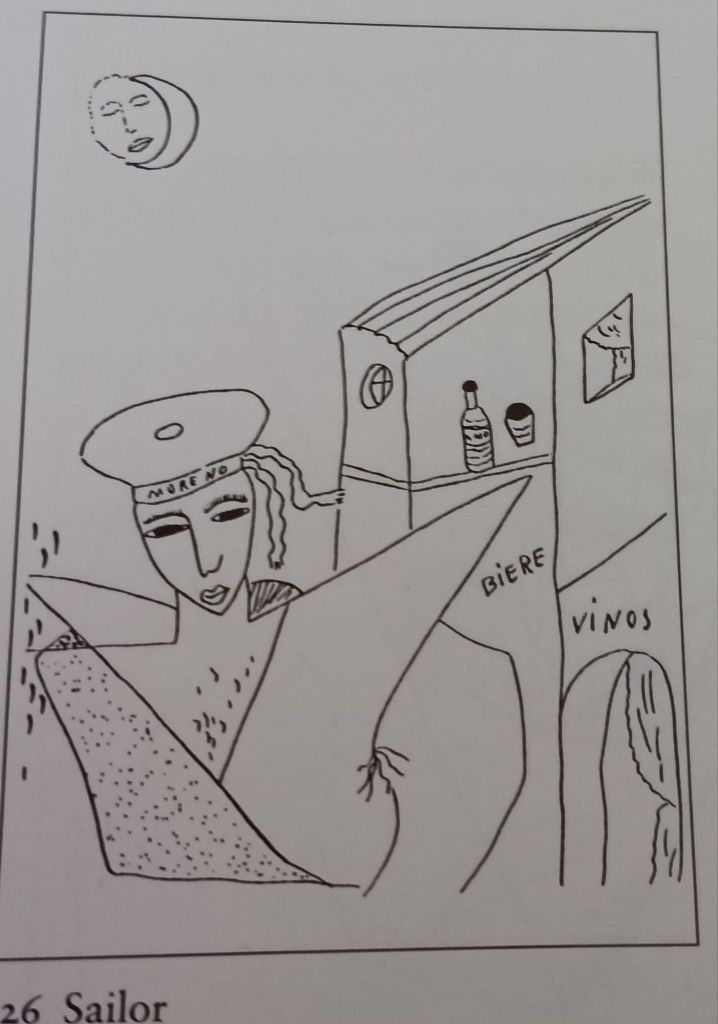 The sailor is another visual symbol through which Lorca explores the question of identity. Here again, as sith the severed hands, sexual freedom is identified with the notion of creative freedom. The sailor has much in common with tne gypsy in that they are both outside society and to a certain extent they both represent freedom and the natural life. … The word ‘love’ is often written on a drawing of a sailor, and sometimes there is an inviting bedroom in the background. (2)
