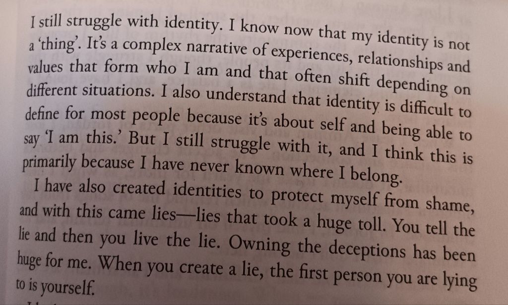 However, contradictions are themselves the issue in matters of the valuing of different peoples in the hierarchies of individual favour, influenced more often than not by silent ideologies in which the values that maintain the status quo dominate. The great thing about this book as in determining what ‘people’ matter to you ‘currently’ and which not is that it shows that such questions, like out identity itself are fluid and contain struggle between different components of the whole assemblage of ourselves. I love this paragraph, the first of Part Two, Chapter 2: Identity. [4]