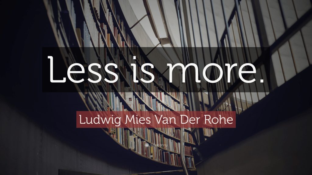 Mies Van Der Rohe thought the phrase ‘less is more’ a defence of the refusal of embellishments in architecture that are both non-functional and decorative rather than part of a basic form or formal concept expressed by a building, but the phrase is a kind of pleasing nonsense that the love of binaries makes possible. Consider Frank Lloyd Wright’s response which exposes the semantic games played by Van Der Rohe, whilst saying, basically, the same thing: