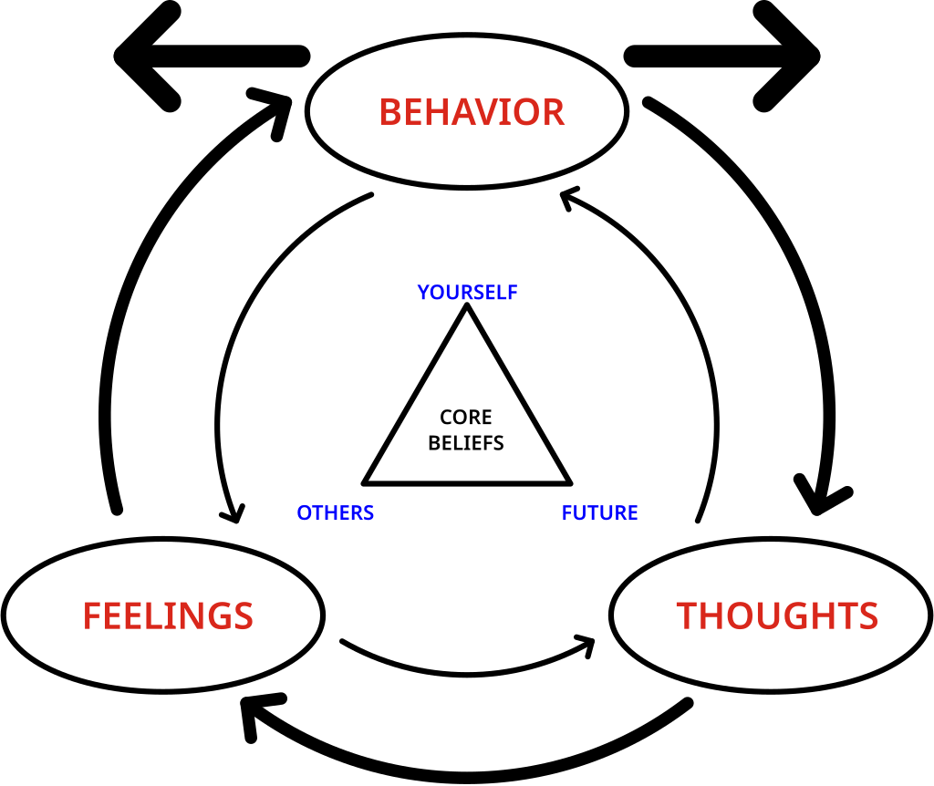 The diagram depicts how feelings, thoughts, and behaviors all influence each other. The triangle in the middle represents CBT’s tenet that all humans’ core beliefs can be organized using three categories: self, others, future. By Urstadt at English Wikipedia