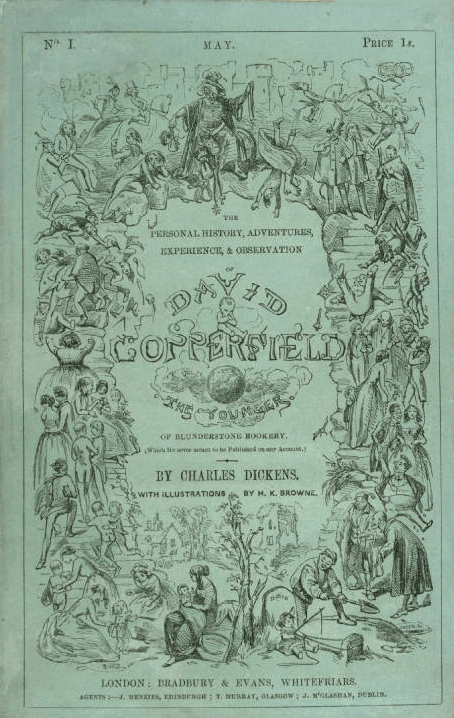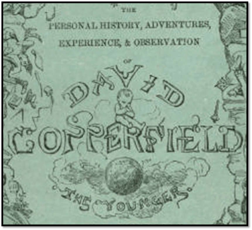 I have always been intrigued by the games played by David Copperfield as the eponymous narrator of the book in which he appears. What is also remarkable about it is zthat as a sentence, it refuses to ‘picture’ that man either with pen in hand or speaking in order to narrate his story. The sentence may assert that what these pages ‘show’ (the visual metaphor is buried there somewhere) will be the visualised versions of David as he progresses through his life, but he clouds the self of the adult life we are about to read. In many ways, so does the cover to the first issue of the serialised novel, which though it clearly shows David as a baby at its base sitting under the headstone of his dead father of the same first name and at the centre sitting on the globe of his own world, it does not identify, which of the characters rising in an encircling oval around the full title of the novel.