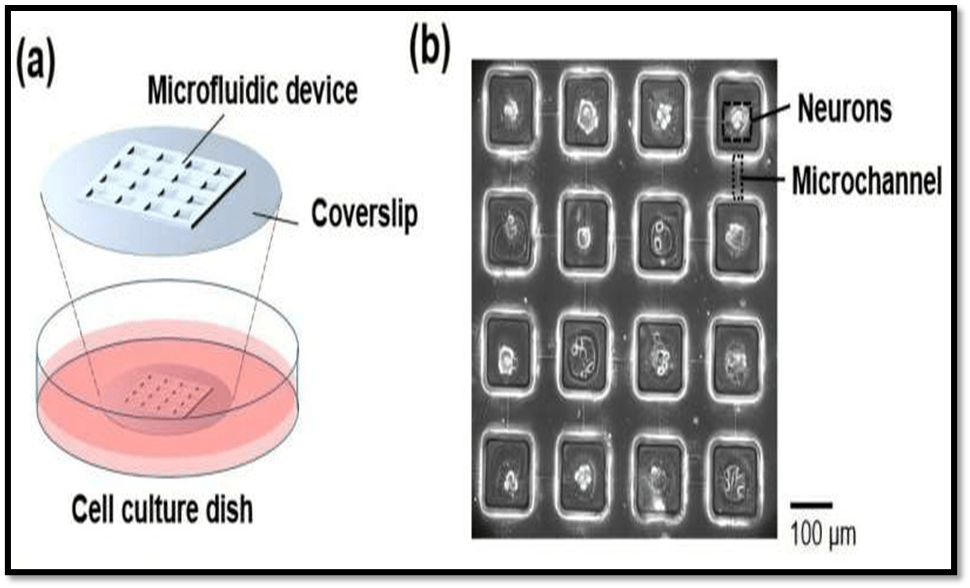 (a) Schematic of the microfluidic device and cell culture. (b) Photograph of neuronal networks. Neurons are separated by square areas, and these are connected through the microchannels. Credit: Adapted from ‘Advanced Materials Technologies’ (2024). DOI: 10.1002/admt.202400894