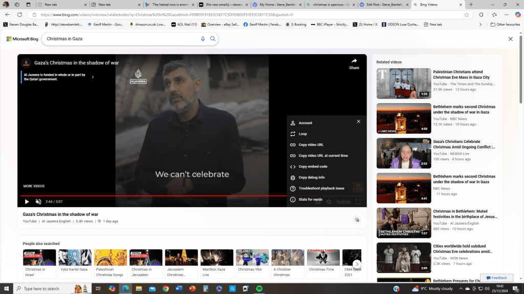 In Gaza, Palestinian Christians are undivided from Muslims as their holy place and places of family refuge are destroyed by Israel. They recognise a unity among Palestinians that must be destroyed. This gentleman’s whole family was wiped out while sheltering in the Church of St. Porhyry, a Byzantine jewel. This is greater than GENOCIDE. It is sheer racial MURDEROUSNESS. Meanwhile, the West decks the halls with boughs of holly and conveniently forget!