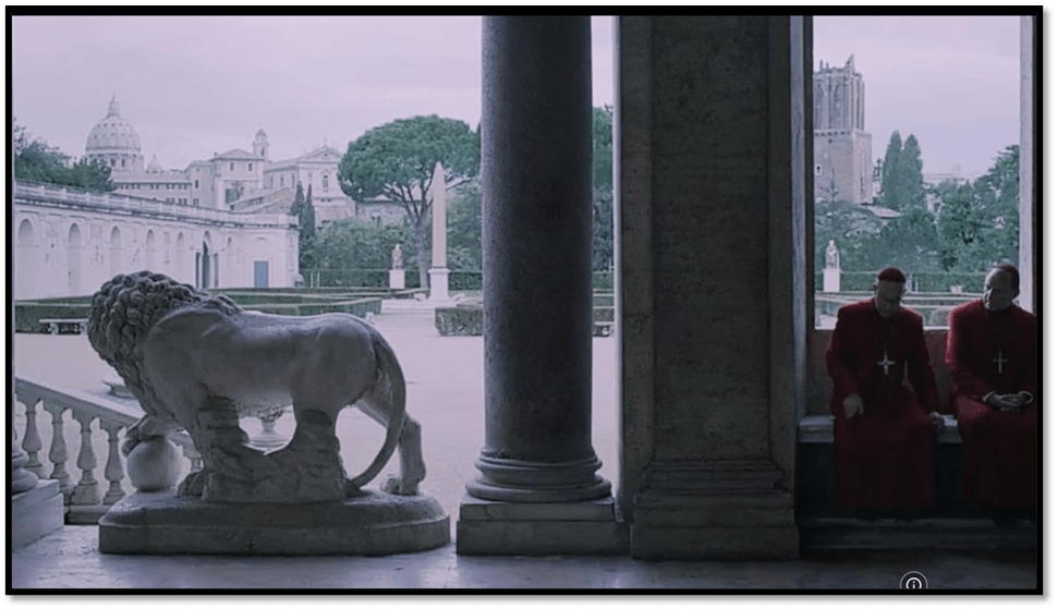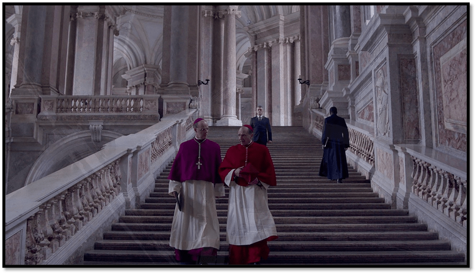 People often ask for conversations in private in the film but often privacy is not in a room but a very open space, such as in this beautiful shot of communion between Lawrence and Bellini, using an open conclave in which basically, though neither of them(both basically good men in as much as masculinity can be good in this film) would call it that, to ‘plot’.