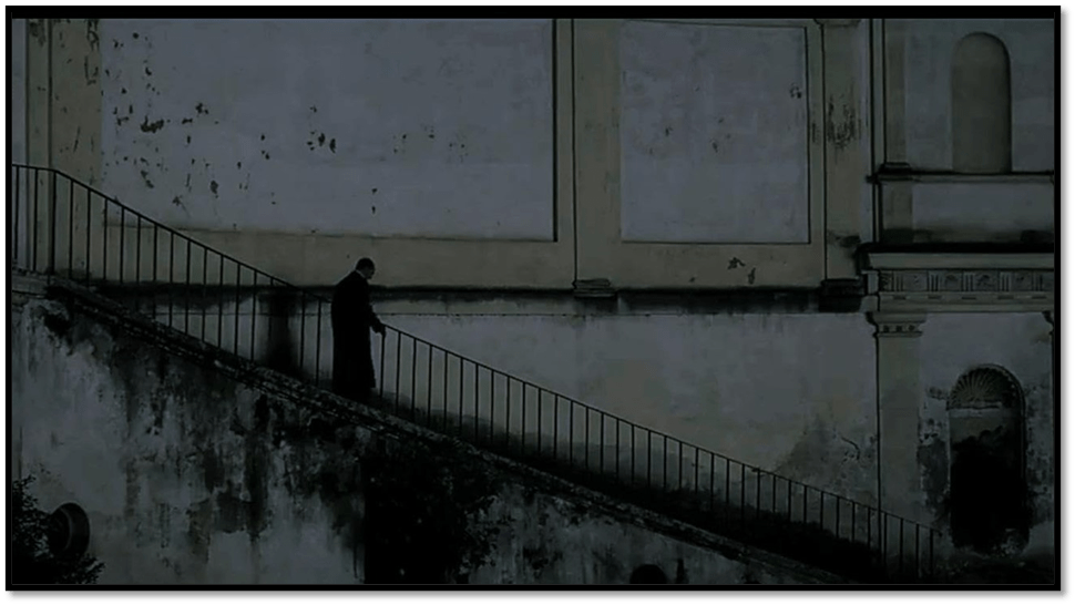 Lawrence himself uses the closure of conversations in transit to request, tell and hear secrets he keeps from others, such as in the scenes with the cleric who executes his commands, below on what feels like the most open of staircases but in fact communicating or seeking information kept in the dark.