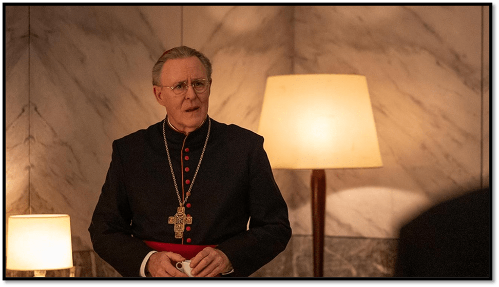 If Tremblay and Adeyemi have secret selves and secret hungers – in the past, present or secreted ambitions for the future, so do other cardinals and perhaps most of all, Cardinale Lawrence. We do not know if Adeyemi or Tremblay, or even Bellini (despite protestations in which Tucci is most brilliant, lie to themselves about their ambition and their uncertainties about their own fitness to attain them. hat is clear is that Lawrence does. He emerges late in the process as a viable candidate for the Papacy. He enacts his surprise and belief in his unreadiness but pressed by Tucci, we know he at some point has already decided on a Papal name for himself – Pope John. There are dark passages inside Lawrence. They seem present but hard to name when he breaks the papal seal locking up the private rooms of the old dead Pope to uncover what that man knew. Isabella Rossellini, playing Sister Agnes – in charge of domestic arrangements in the Papal palace and for the conclave, enacts those doubts we have of him when she presses her ear to the door of that locked room as she observes silently that Lawrence has turned out the light within, having perhaps heard her. There are a tissue of symbols of hiding and shadowing the inner self here.