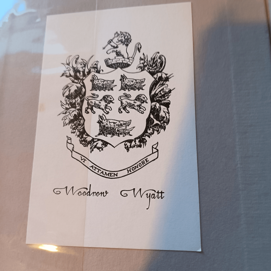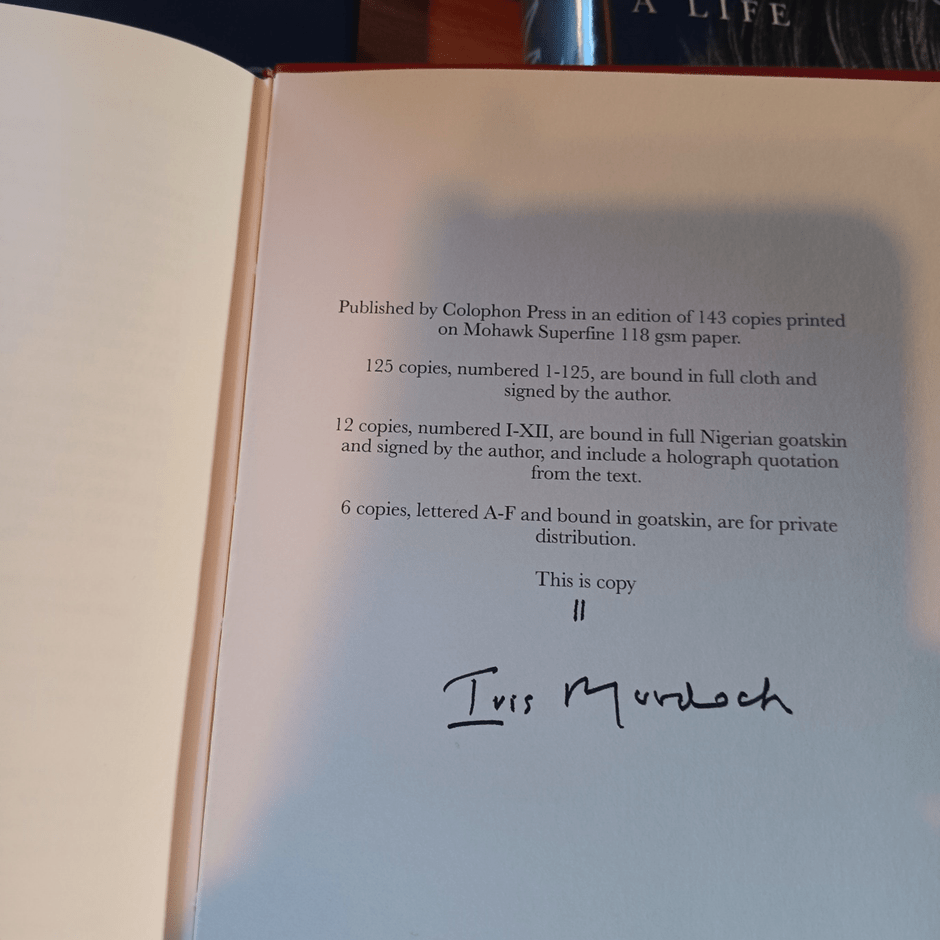 Wyatt was very much the kind of man Murdoch admired and this copy as well as bearing the standard signature on the limitation record page at the end of the slim book (87 pages) but also has a signature and dedication (;’For Woodrow with all best wishes from Iris – and marked by a hand-drawn star) as well as Wyatt’s personal bookplate on the fixed front end paper. I looked again at the book, neither remembering when I purchased it nor ever having read it.