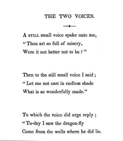 Being read, rather than just heard to an over-forceful beat, this is not one question with the word ‘will’ repeated but two questions from a divided personality, somewhat like The Two Voices in Alfred Tennyson‘s narcissitic-cum-suicidal poem, written in 1842, of that name: