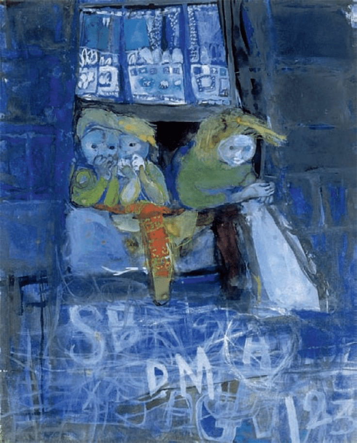 Eardley later rather abstracted her ‘kids’ into the meanings they shouted ot to her, where the real, the notational and the meaningful merged (see Children and Chalked Wall No. 4) where pattern and signification play against other by the use of graffiti and text, somewhat abstracted from its appearance on real Glasgow walls. Sex / gender becomes even more part of pattern. There are numerous examples of these paintings