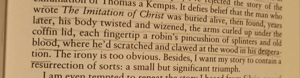 Lots of the story has similar problems. This was my first reading of it yet elements within it resonate with the published stories and with some he told in public events I witnessed at Edinburgh Book Festival – such as the story of Thomas à Kempis, which he had heard from religious men who knew of the exhumation of the holy man’s coffin and the grisly rebuttal it contained of the putative saint’s belief that even in death and rising again he could imitate the life-story of Jesus Christ, a story in Ether rejected as being ‘my own’ bur resurrected just as he imagines his mother too, as he sits at her grave, having been buried alive like Thomas. Yet Burnside too wanted a ‘resurrection’ story for himself as much as à Kempis, even if in terms of a narrative rather than an experience. Here is the bit – horrible enough – in Ether where he says so: (2)