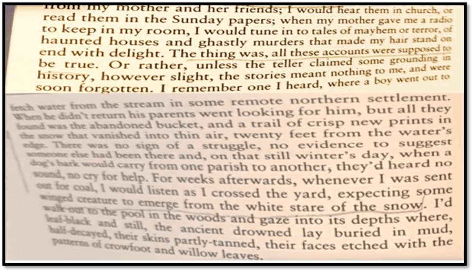 At that event – it was actually on his novel Glister, another story of boys under existential (and in Glister sexualised) threat – I asked why and how he revived Gothic fantasy as a mode of writing that had meaning for the contemporary age. Burnside sort of exploded for he was, he said, fed up of literary types seeing fantasy and the Gothic where truth actually lies. This tells us much of how we need to read Burnside, which is not as a mere literary experimentalist with genre but as having ‘some grounding in history’; some claim that the story was ‘supposed to be true’.That ‘some winged creature would emerge from the white stare of the snow’ is in the same imaginative (but not there imaginary, space as the story of The Devil’s Footprints. For Burnside the capture of the living by the dead is real enough – it just matters whether it is a clean capture – in white snow where all prints disappear as the angel / devil ascends with his prey or game, his food or Ganymede, or in the primeval dirt and mud under water or deep in the soil, a story he later in the story associates with the folk myth of Jenny Greenteeth.