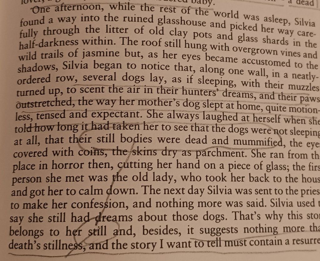 Still bodies are dead ones but mummified their silent motionlessness is near a forever moment about which silence reins (‘nothing more was said’) but death’s stillness belongs to Sylvia, that impersonal nymph or mum’s friend, STILL (continuous in time-space).And that why the prose continue that ‘the story I want to tell must contain a resurrection’.