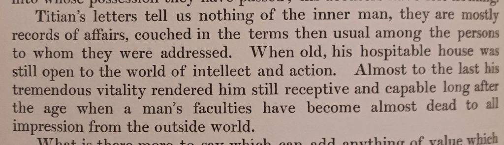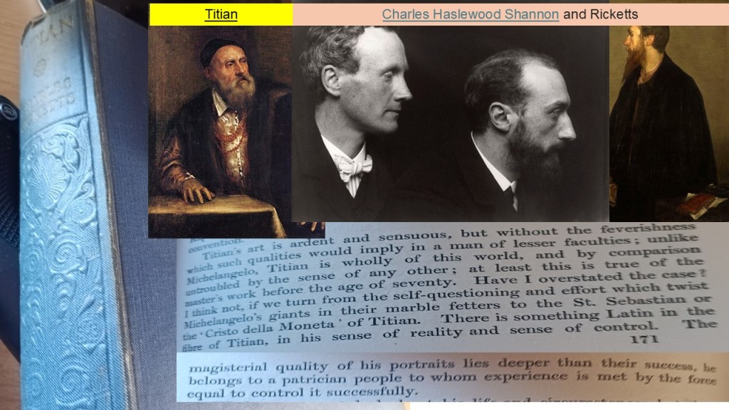 As I flashed about for subjects for my blogs, I turned today to a book I have been meaning to turn to when I acquired it, thus motivated by seeing an exhibition of the work of Charles Ricketts and his lover, Charles Shannon (who lived together with him in London) at the Tulley Museum in Carlisle. The work of this queer artist, and his ‘husband’ sorely needs looking at seriously again I think, but meanwhile I glanced over his book (and its 181 monochrome plates), concentrating on his summary of the great Titian’s achievement in Chapter XXIX (‘Conclusion’).