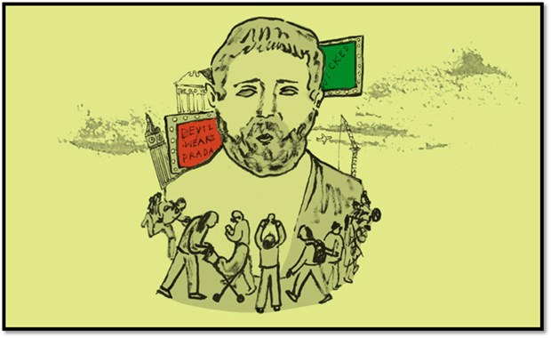 Clearly a wordless chorus is still a move away from grounding the tragedy of individual characters in the language of communities, just as Icke sets out to do, but music and dance may do so much more than I can now imagine. I cannot wait to see this. Higgins clearly explained to Damielle Rhoda that that the graphic she should draw need to emphasise the modernity of the message of these plays, although I find her illustration rather over-literal in this sense (see below: