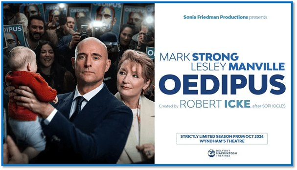 It is probable that this summary applies to every version of Oedipus, perhaps Sophocles’ drama as a whole Higgins admits but this is especially so in Icke’s version because he robs the text of a ‘chorus’ representing a kind of communal consciousness of what is thought moral or immoral, worthy or unworthy of the actions of individual actors. Higgins piece though is not about Icke’s version per se. Her theme is that Sophoclean dramas are ‘storming the West End’. Asked why, she says: ‘Because in our extreme times, his plays say the unsayable’.[1]