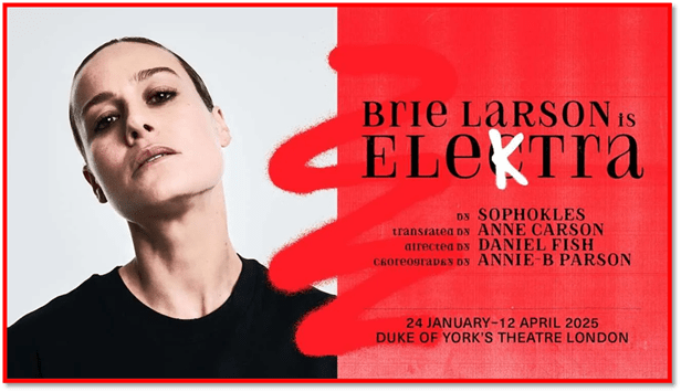 Hence, I felt better. I could catch the other two Sophocles in available – Oedipus at The Old Vic with Remi Malik as Oedipus and Indira Vharma as Jocasta in a new version by Ella Hickson, and Elektra at The Duke of York’s Theatre with Brie Larson as Elektra and in a new version by feminist poet and classicist, Ann Carson, on whose works I have blogged before for I love her work – see links here to (for the Trojan Women Comic Book Version, Norma Jeane Baker of Troy (spoof of Euripides’ spoof Helen) H of H [a free version of Hercules}. So nothing missed! I don’t know.