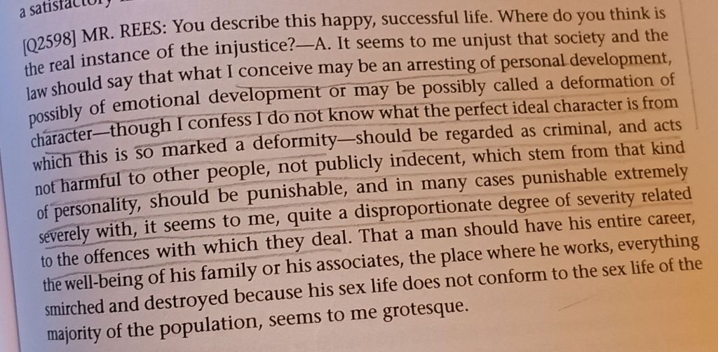 Now, as I query the internalised hatred of others to what was the content of my feelings and desires as a queer adolescent guy, I think of one of the answers (labelled A) to a question asked by a Wolfenden Committee legal representative, Mr Rees, I think of this incident, for it tells of how medicine and a hegemonic view of psychology that normal sexual development always led to heteronormative ends made by an anonymous respondent (he was in fact a doctor), other than being labelled a ‘homosexual’, that carried on the torment and the fear after the law had so much done its worst and had to changed. There was no relaxation of the ‘torment and the fear’ if what you did was no longer legal but proved you to be subject to ‘ an arresting of personal development, possibly of emotional development or may be possibly called a deformation of character’.
