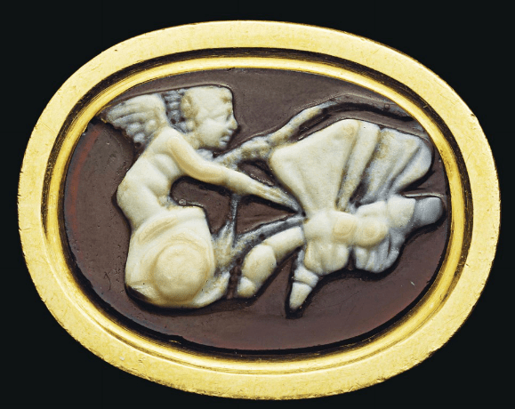 This Roman sardonyx cameo from the 1st-2nd century AD shows Cupid on a butterfly-driven chariot. It is set in a 19th century gold ring. The butterflies here represent Psyche. In Greek mythology