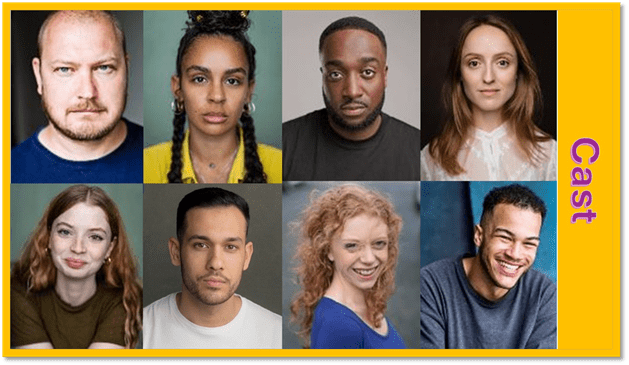 From top let clockwise: Prospero Peter Moreton, Ariel Carla Garratt, Caliban/Gonzalo Shakeel Haakim, Alonso/Trinculo Isabella Marshall, Sebastian/Stephano Kiren Kebaili-Dwyer, Antonio Rachel Winters, Ferdinand Garon Akbar Clark, Miranda Scout Worsley