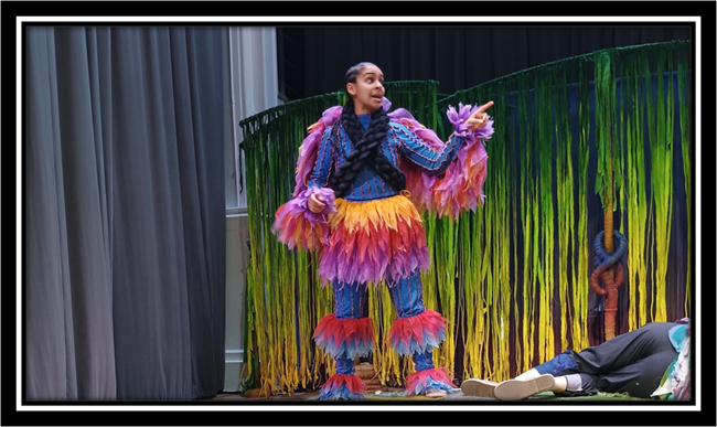 Theatre is about a constraining reality given relative freedom to play and hence this production starts with brilliant Ariel (played by Carla Garret) enacting the Tempest at sea that they have roused on Prospero’s command – by wearing a sailing ship on their head and tossing it with that head through imagined elements of which Ariel allows their voice to copy. How to better this – that to run amidst your audience of – 13 ages encouraging them to invent noises fit to the chaotic subject and then copy them, asking them to repeat back in return. It sounds like pantomime – but it was so only in as much as pantomime too engages the self in free play.