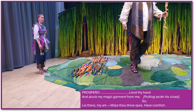 Above he walks with magic staff and the multi-coloured cloak. Even in the very early scenes he pretends to slew off the ideological authority his magic gives him, but he is poor at giving up power at lest until the play of the world eventually ends. See him here with Miranda in Act 1 Scene 2, line 27, with the magic garment cast aside (what child has not experienced this in a more sombre reality):