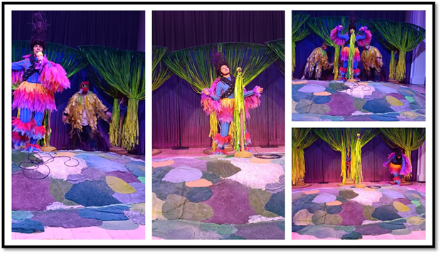 This is the space as Geoff and I saw it set up before the performance – a mix of subtle-cum-gaudy colour and deliberate rough magic, with a greenery that in its artificiality still looked like nature intruding on art (and perhaps vice-versa,