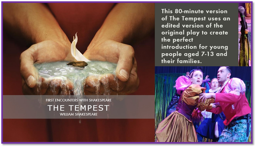 Bookish people like myself – as well; as finding this blank verse the most satisfying of any example – weep at the beauty and pathos of Prospero promising to ;drown my book’. Do children learn these things as they hear them. I don’t know. I dare not imagine the fragile growing defensive structures and the desire for freedom looking as if it might soon be lost in the head of a 7 – 13 year old. The point is the text in this play was not edited other than in the cutting of a number of scenes and part-scenes but its verse (apart from the sibling cross-gendering I mentioned above) is left in all its grandeur. Who dare say that no 7 – 13 year old felt its power. And all 7-13 year olds know of parents who while pretending to embrace communality, still ‘ave required’ an extra service ‘to work mine end’ on their children.