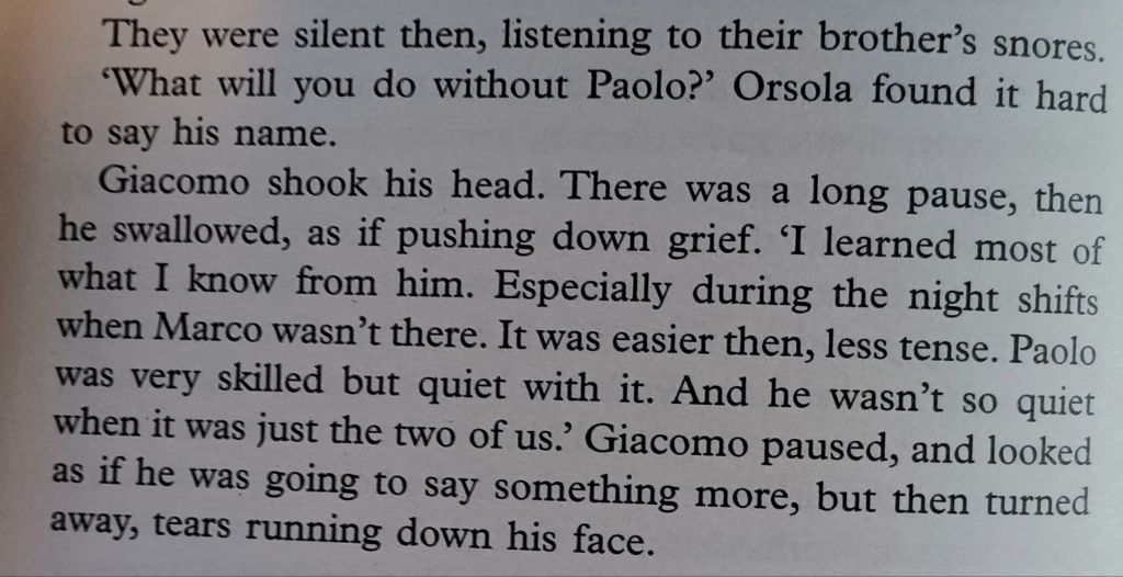 When the death happens Orsola is bringing into the workshop reserved only for men in the family, a stew of eels. She drops the stew and its contents – once at home only in fluids – into the flow of blood that has gushed from Lorenzo. Orsola’s mother calls for sheets – they are white of course but brough in by her daughter-in-law Maddalena. The whole scene is one that shows how the flow of narrative is slowed up and, for a time, stopped in the still and thickening mess of the present time. The word ‘flow’ is used once but implicitly it is there throughout – being STOPPED!